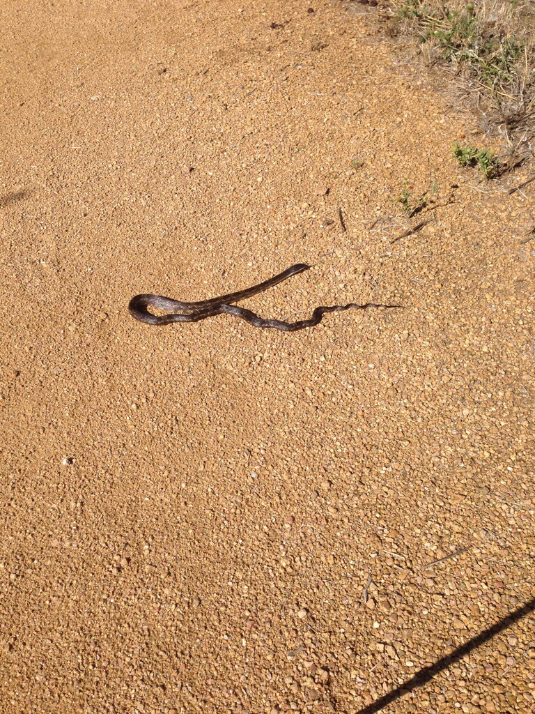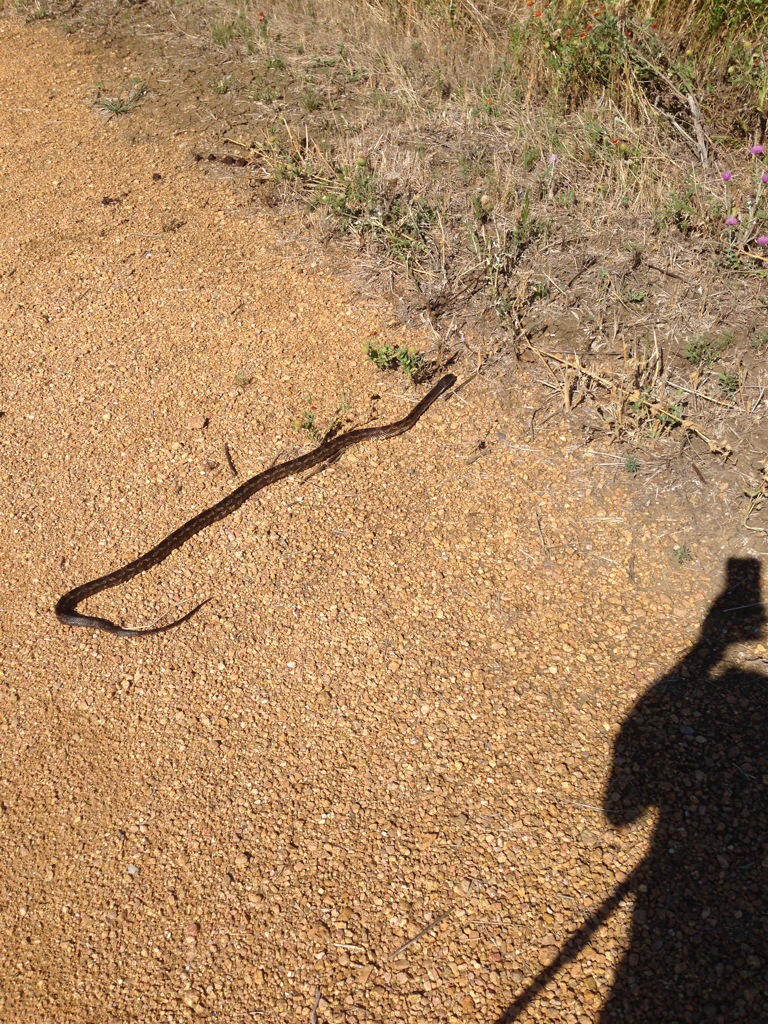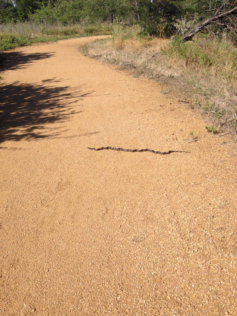 Just past that mile marker I was making my way to the “blackberry patch”, when I noticed something long laying in the middle of the trail. I slowed my pace and realized I had come upon a snake, taking advantage of the late afternoon sun and the warmth of the foot path. Nice thing about getting on the trail around 4:30PM. No one wants to hike/run in that type of heat. Yesterday was particularly fun given we had storms that morning, putting the humidity at a nice 50%. So Mr. Snake was taking advantage of the sun and the solitude of the trail given the hour.