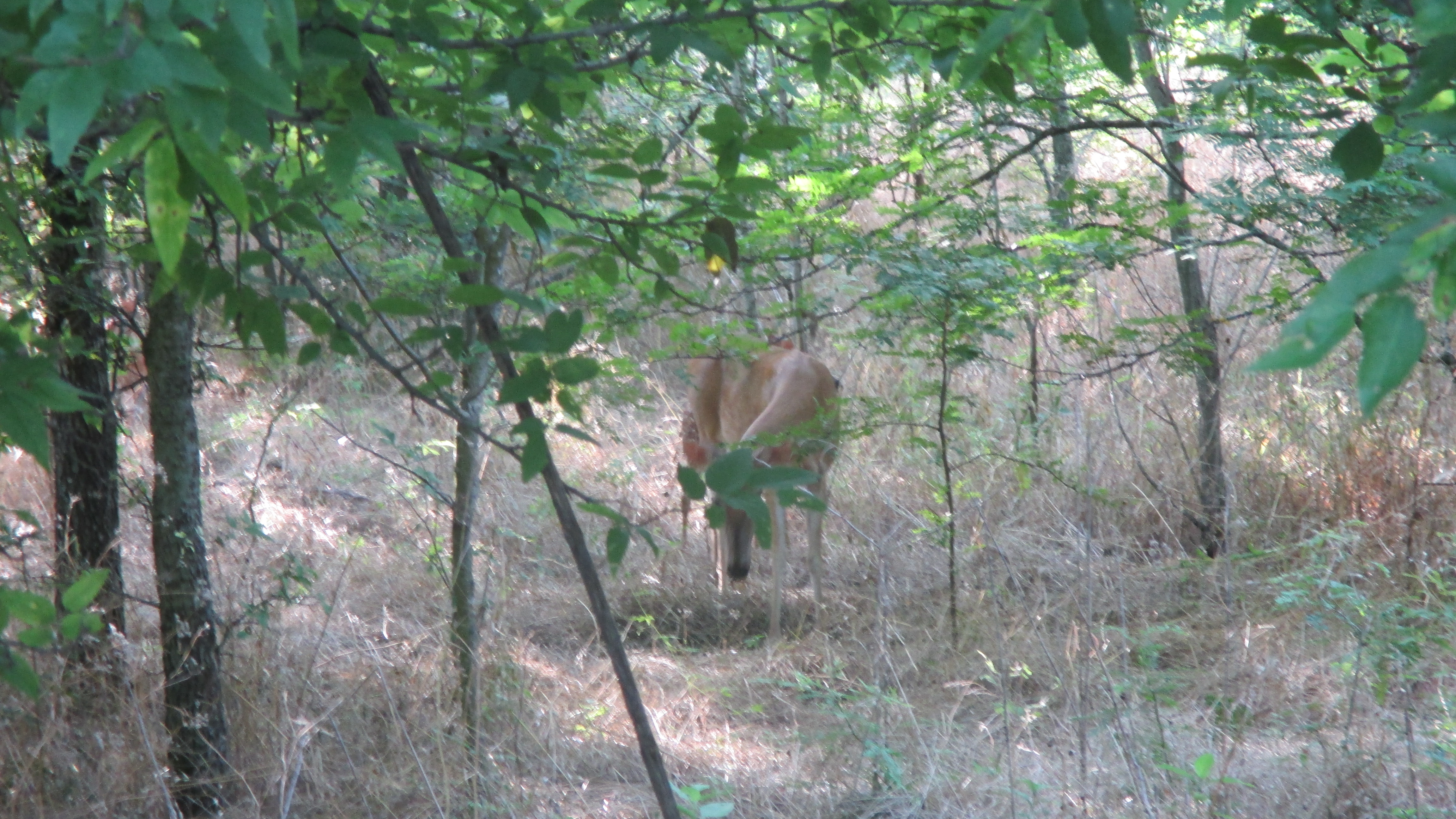 I finally arrived at the Ray Roberts Lake State Park there off of FM 428. They have great modern restrooms, drinking fountains, and plenty of picnic tables to sit and rest. I had my lunch glad that I had brought a bottle of Ozarka vs. having to sip water from my hydration pack. When you’re thirsty like that you just want to guzzle. I took about a 30 minute break and started on my way back. I decided to start back on the equestrian trail. Not sure why…there were TONS of grasshoppers everywhere bouncing off of me…not to mention I was walking through a patch of recently mowed Johnson grass. As I got to the first tree line I startled another deer. But this time she had two fawns that she rustled up out of the grass and had them follower her deeper into the woods away from the stranger who had suddenly disrupted their late morning siesta! I decided then and there that the next time I hike this trail (which will be this weekend) I think I’m going to hike the equestrian trail. During the hike I saw a hill that must have really great views of the area. Every map I saw talked about the “scenic overlook” but I’ll be damned if I ever saw the path for it. However, upon further inspection I realized I could easily get to it via the equestrian trail.